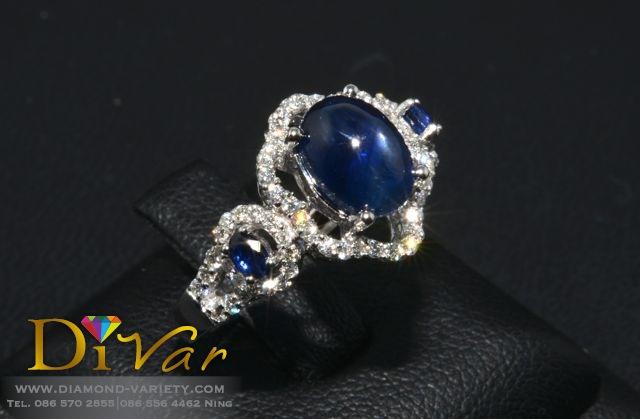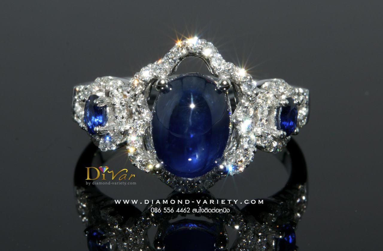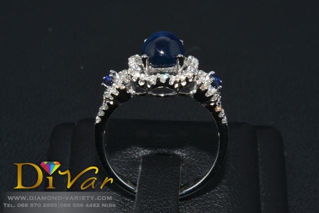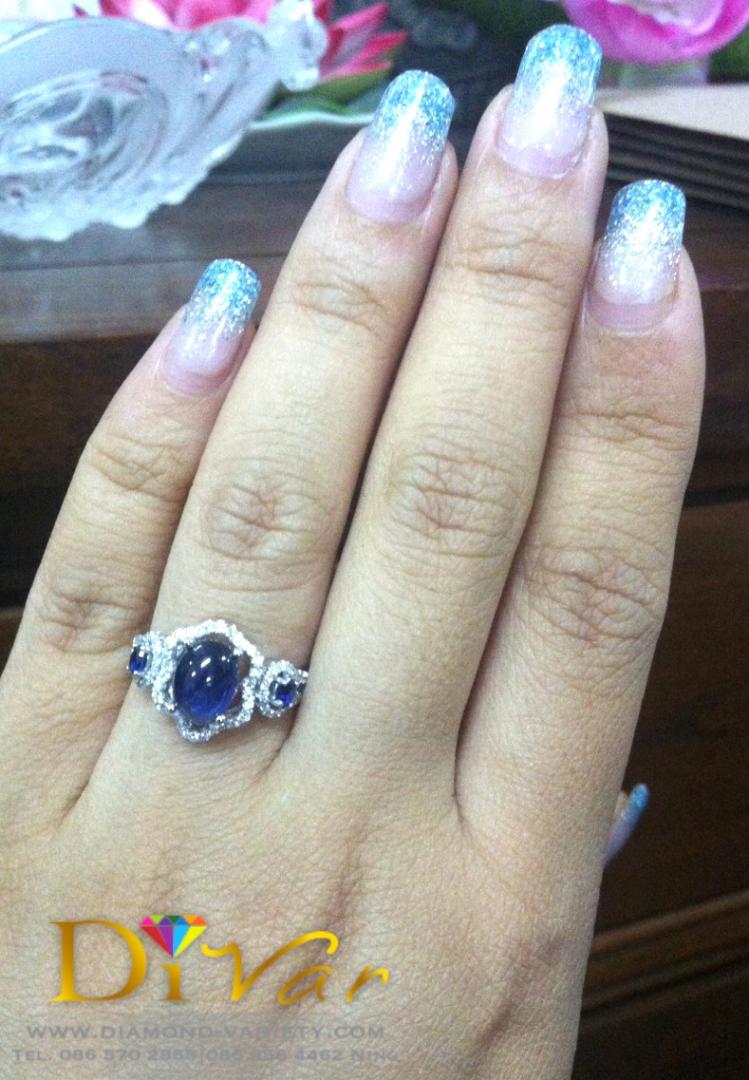 ประเภทสินค้า : แหวนเพชรไพลินเจียรหลังเบี้ยเม็ดใหญ่ และเจียรเหลี่ยมเม็ดเล็ก เพชรแท้รวม 0.58กะรัต